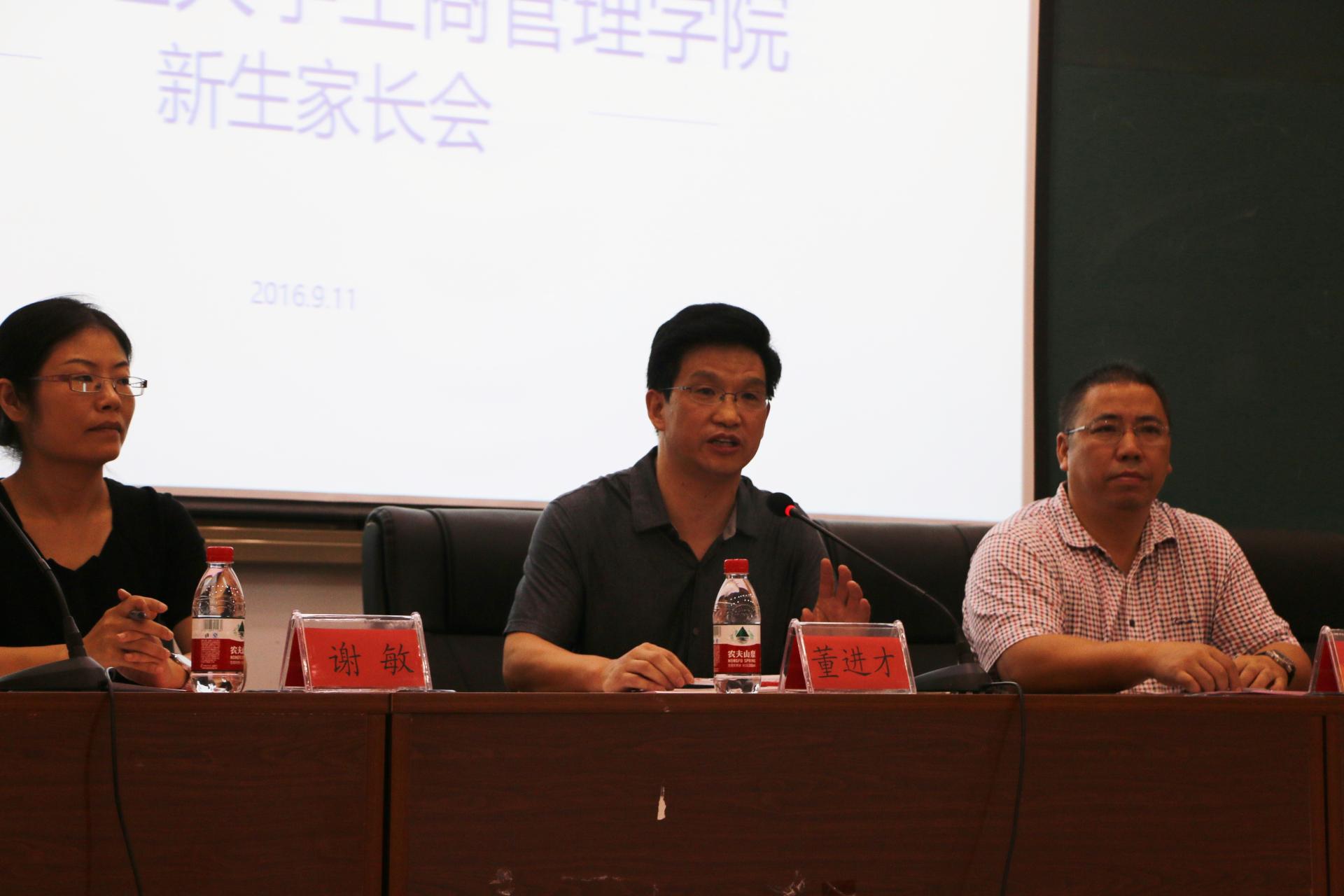 2016级新生家长会在学院楼217室举行。学院院长董进才、党委书记黄卫华、副院长王建明、倪文斌,带班辅导员以及新生家长们共同参加此次家长会,党委副书记谢敏老师主持会议。