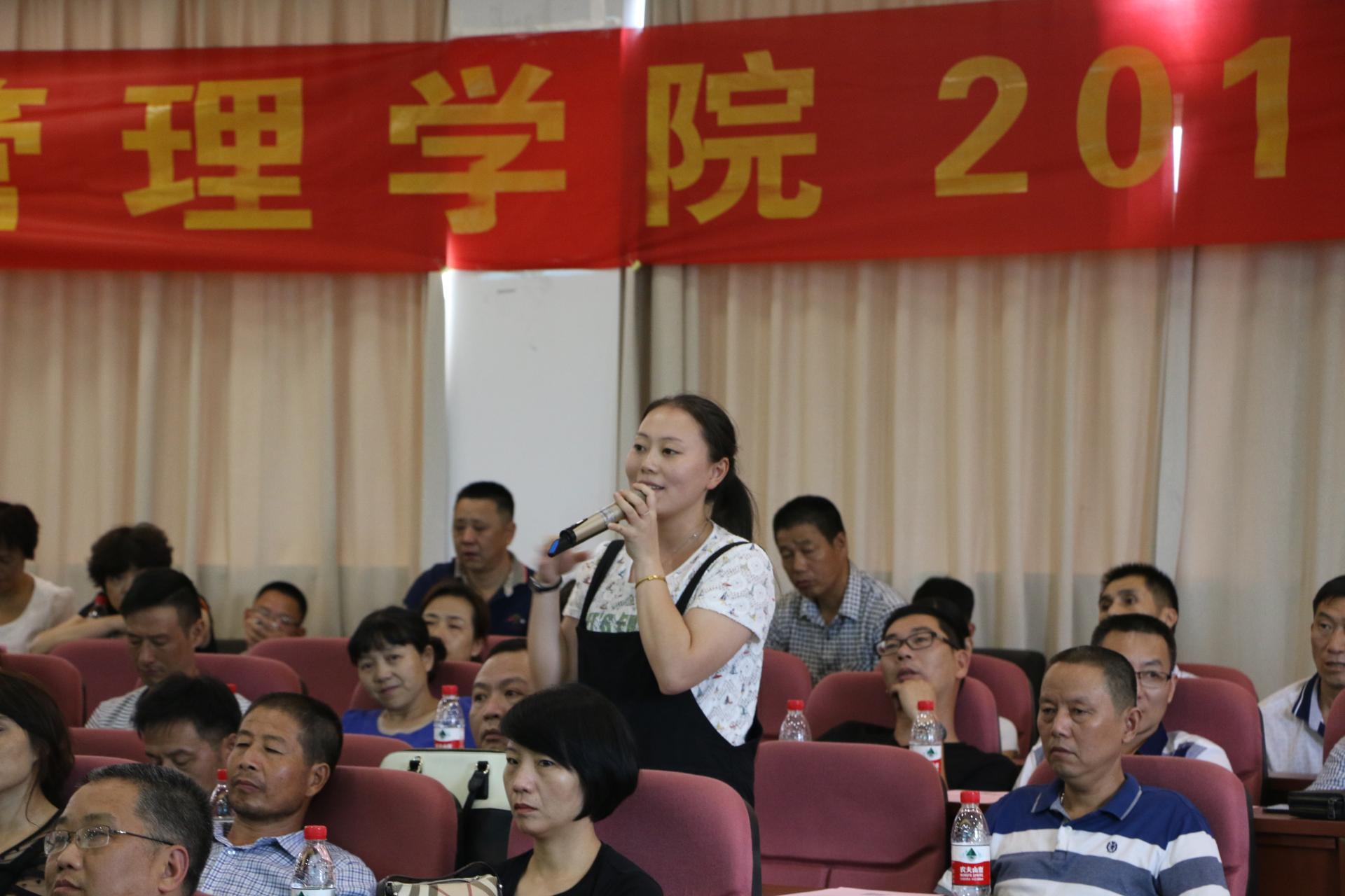 与以往不同的是,此次新生家长会增加了家长代表发言环节,学生家长代表颜邦林先生进行讲话,颜先生首先向在场的各位老师表达了教师节的祝福,其次表达了作为家长对于孩子的殷切期望。他希望学院能够培育出具有人文精神与科学精神的人才,能够拥有高水准的专业素养和学术素养。最后他还希望学院在教学模式上大胆探索,实现家院共同体,让学生身边的行业佼佼者、生产标兵也走进讲堂向学生讲述他们的奋斗经历。在之后的家长提问环节,也有家长就转专业以及外语学习进行提问,学院领导都有针对性地做了详细回答。