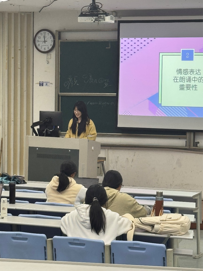 通过吴芷欣学姐对部分经典诗歌、文学作品的诠释和朗诵技巧的讲解,同学们感受到朗诵不仅仅语言的表达,更是情感的共鸣、思想的传递、文化的延续。此外,吴芷欣学姐还为同学们展示了练习方式,鼓励大家走近朗诵,探索声音的诗篇,不论是用朗诵去触摸古老的诗歌,还是用声音去书写属于当代的故事。