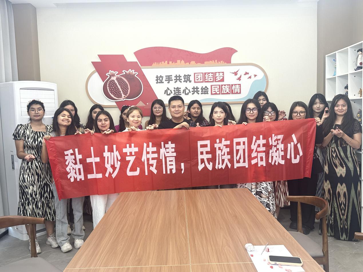 活动现场,新疆各少数民族学生结对创作,在交流中增进理解,维吾尔族学生阿依仙木古丽负责哪吒发型的塑造,哈萨克族同学帕力扎专注火焰纹的绘制,两人反复调整细节,最终呈现出一件兼具民族特色与艺术美感的作品。活动尾声,各族学子手持作品合影留念,背景墙上“中华民族一家亲”的标语与黏土哪吒的火焰纹交相辉映,成为民族团结的生动注脚。