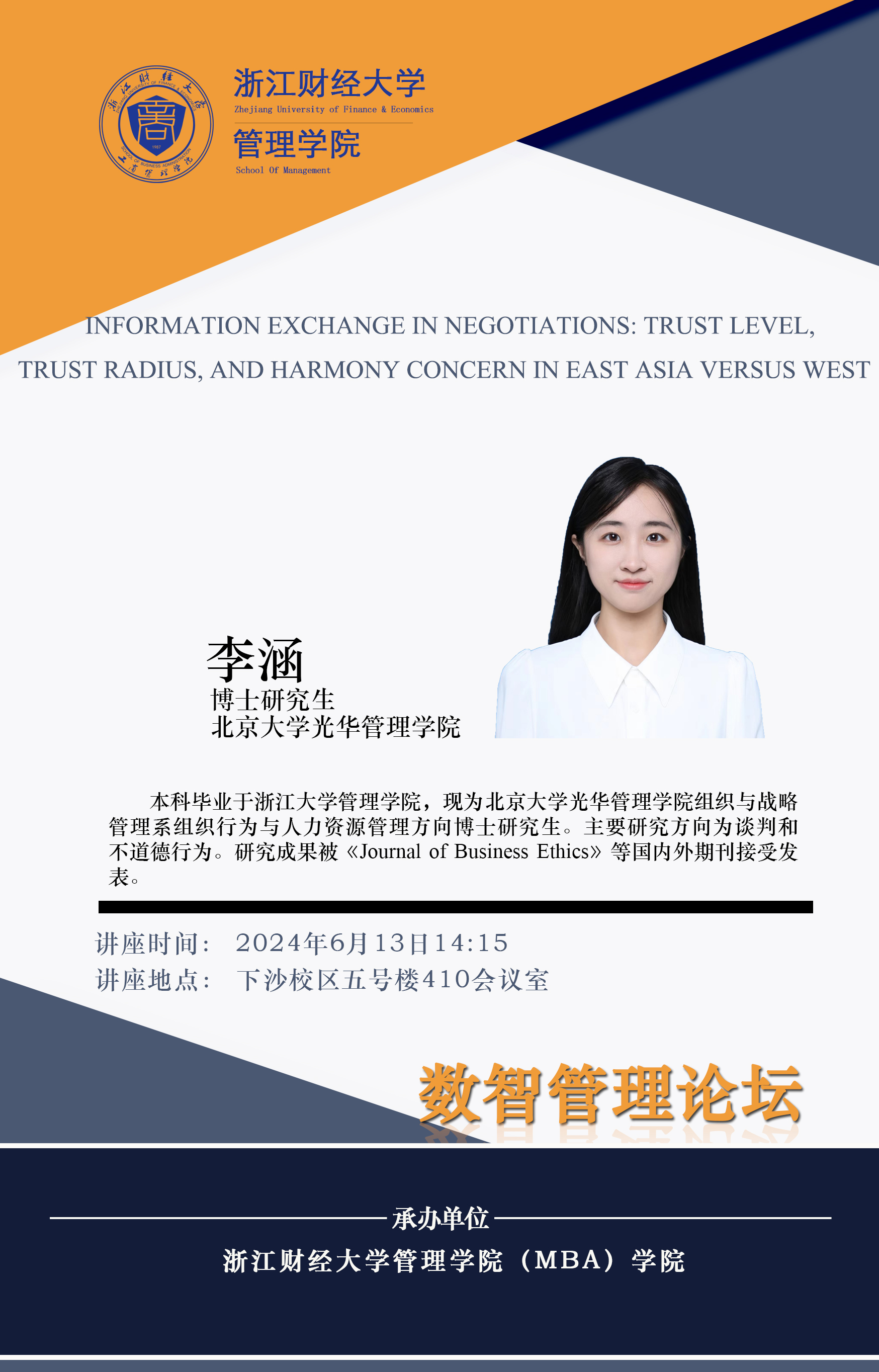 【讲座预告】李涵:Information Exchange in Negotiations: Trust Level, Trust Radius, and Harmony Concern in East Asia versus West