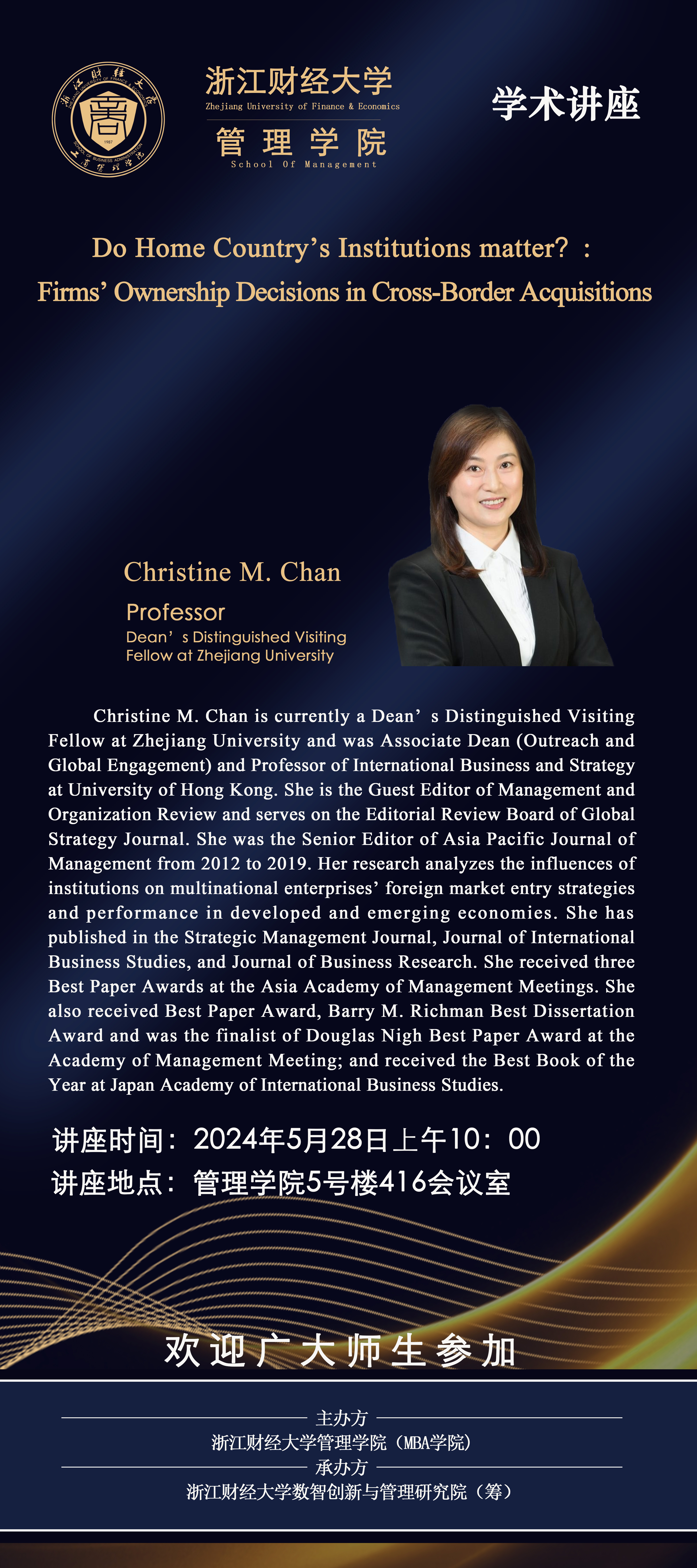 【讲座预告】Christine M. Chan教授:Do Home Country’s Institutions matter?: Firms’ Ownership Decisions in Cross-Border Acquisitions