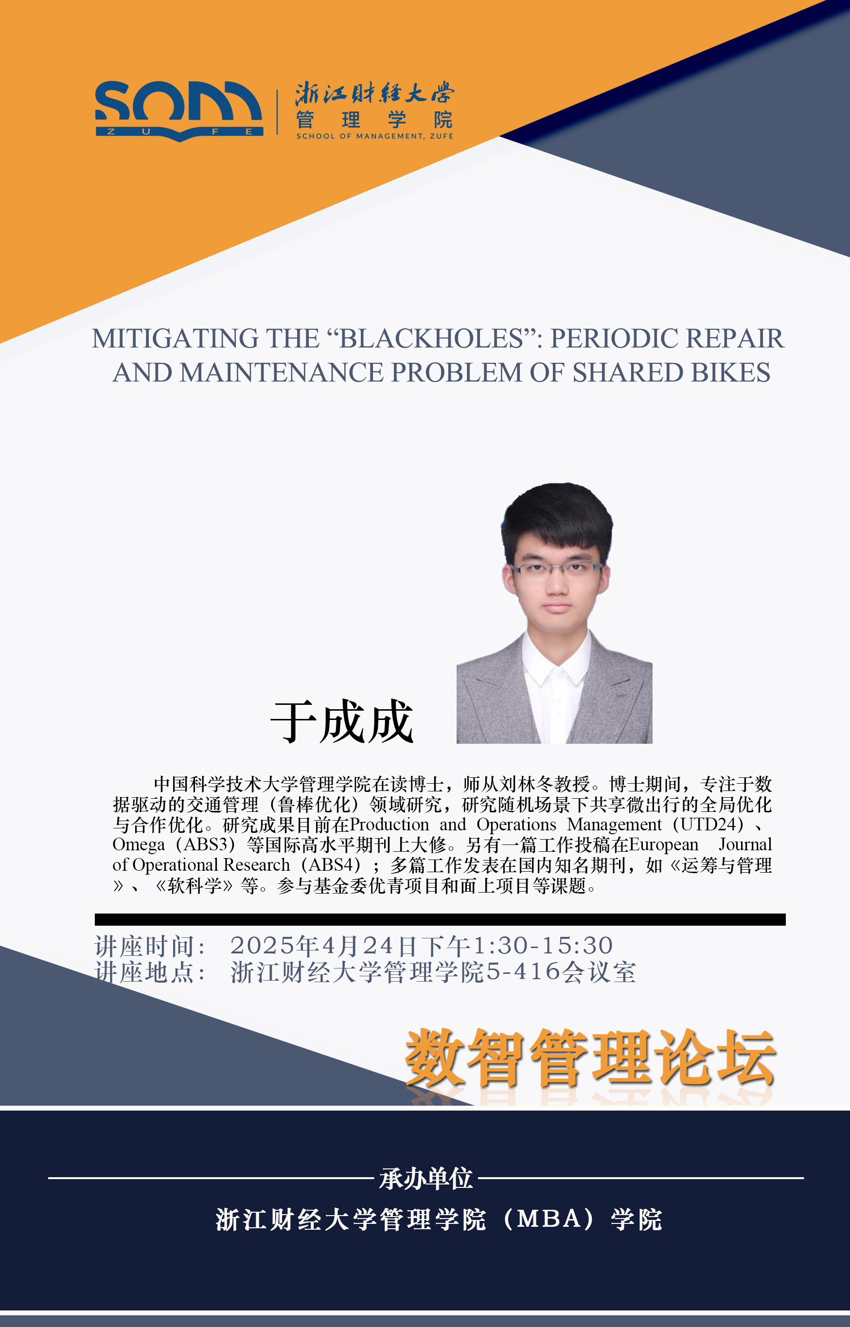 番茄小说 新财经战略系列学术活动2025年第21期【学术报告】于成成:Mitigating the “Blackholes” Periodic Repair and Maintenance Problem of Shared Bikes