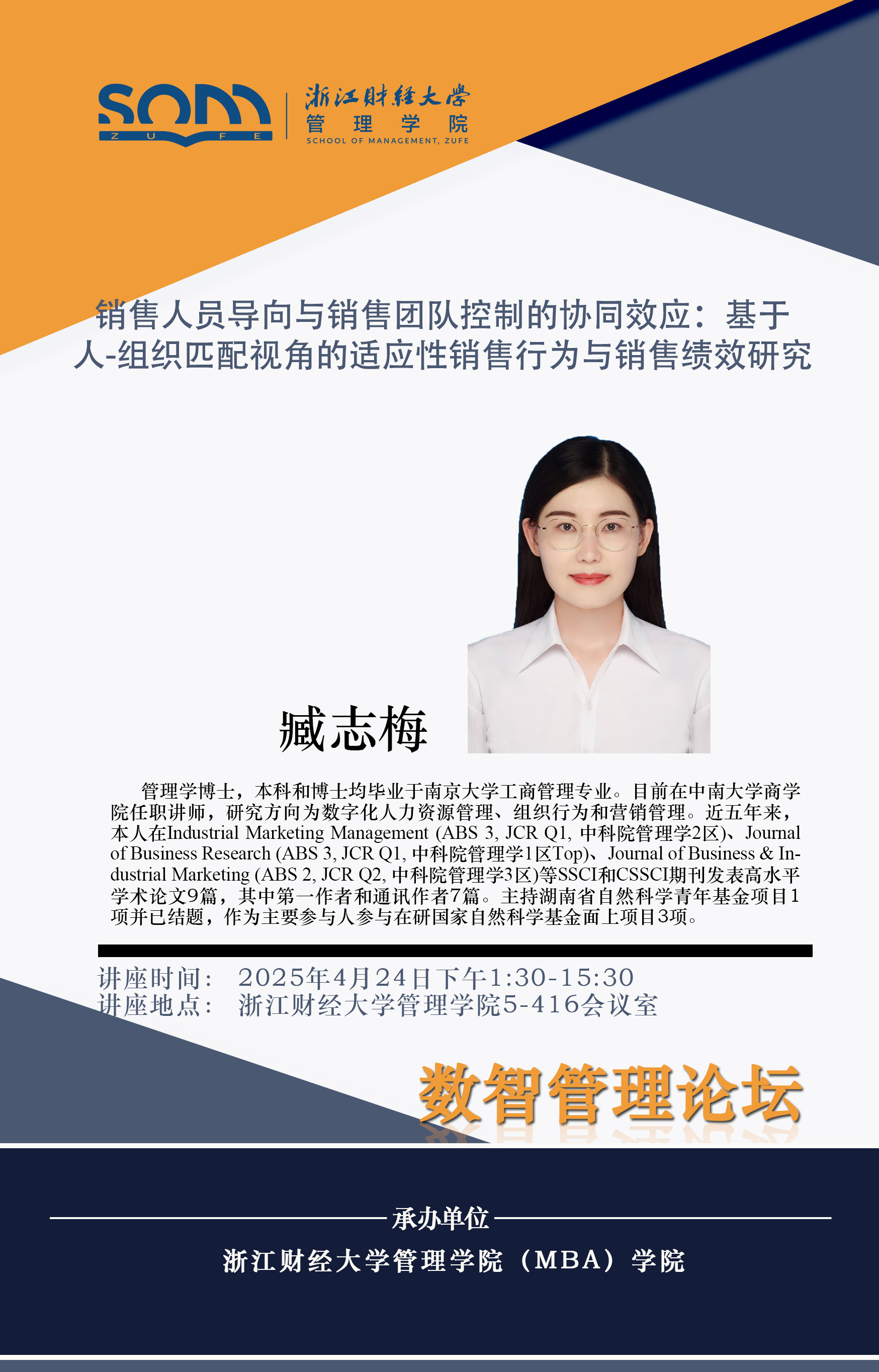 番茄小说 新财经战略系列学术活动2025年第23期【学术报告】臧志梅:销售人员导向与销售团队控制的协同效应:基于人-组织匹配视角的适应性销售行为与销售绩效研究