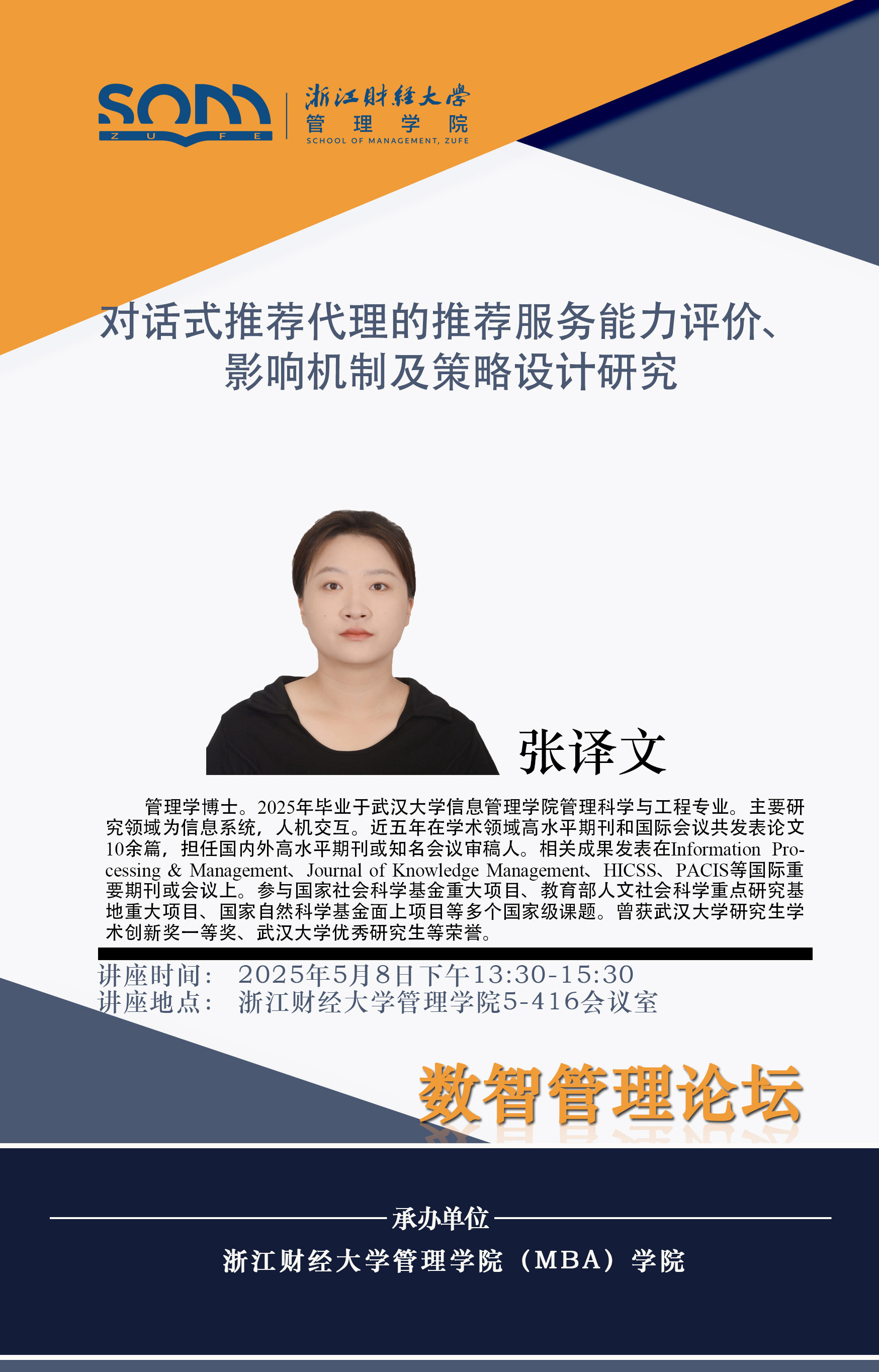 番茄小说 新财经战略系列学术活动2025年第32期【学术报告】张译文:对话式推荐代理的推荐服务能力评价、影响机制及策略设计研究