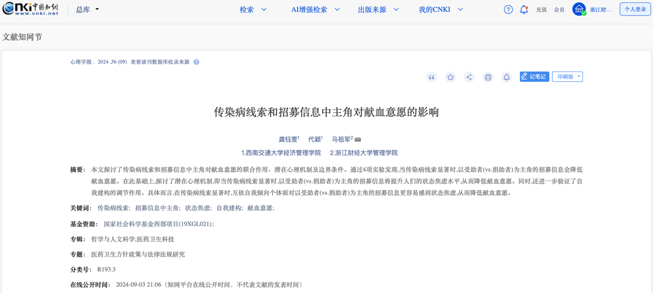 马祖军教授作为通讯作者,撰写的“传染病线索和招募信息中主角对献血意愿的影响”被国内心理学领域顶级期刊 《心理学报》录用并发表。